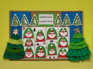 Tuż przed świętami urządziliśmy konkurs na najdłuższy łańcuch choinkowy. Dzieci przez kilka godzin robiły go z papieru kolorowego. W efekcie powstał kilkumetrowy łańcuch, który wisi na korytarzy szkolnym. Swój początek ma przy świetlicy, a koniec przy gabinecie naszej Pani Dyrektor - każdy może go zobaczyć :)